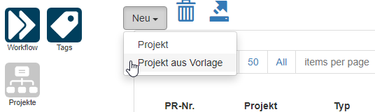 Nachdem die Projektvorlage vollständig definiert ist, kann man sie im Modul Projekte → Neu → Projekt aus Vorlage anwenden.
