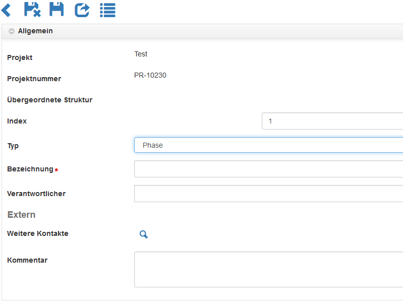 Hier werden allgemeine Informationen der Projektvorlage festgelegt. „* “ markiert Pflichtfelder. Nach einmaligem Speichern kann auch die Projektstruktur eingetragen werden. Über das Plussymbol im Abschnitt Projektstruktur kann eine neue Phase, Arbeitspaket oder Teilaufgabe erstellt werden.