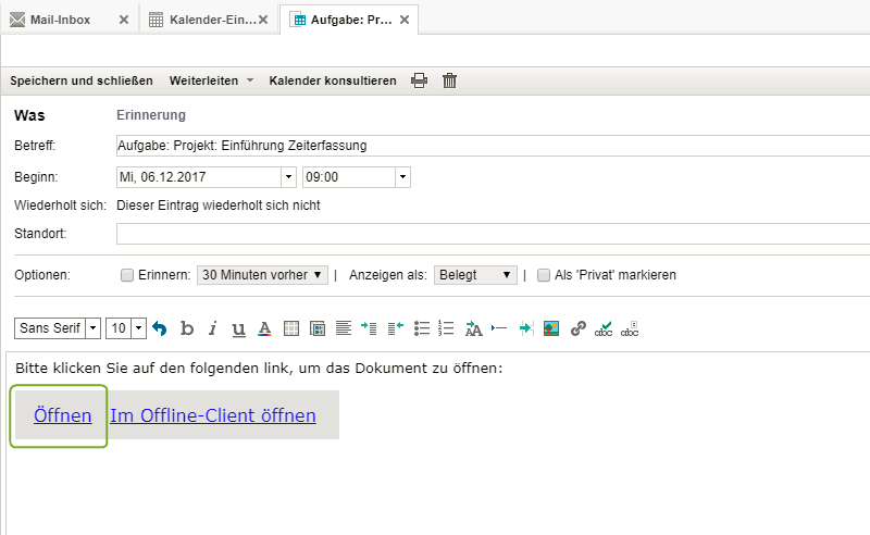 Aufgabe aus einem Kalendereintrag öffnen