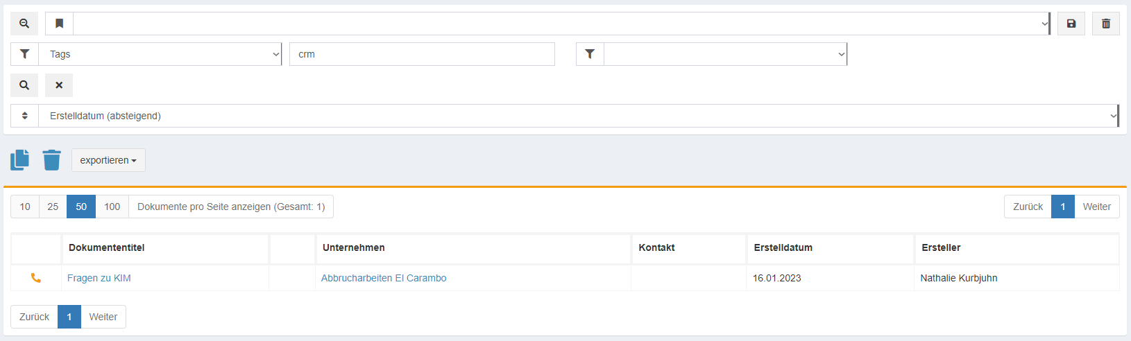 Tags sind Schlagwörter. Mit ihnen kennzeichnet man Unternehmen, Kontakte, Dokumente … Nach Tags können Sie filtern und dadurch ein bestimmtes Dokument schneller finden. Mit Tags können Benutzer ihre eigenen Suchbegriffe vergeben und später nach diesen suchen.